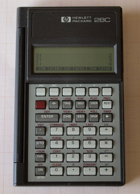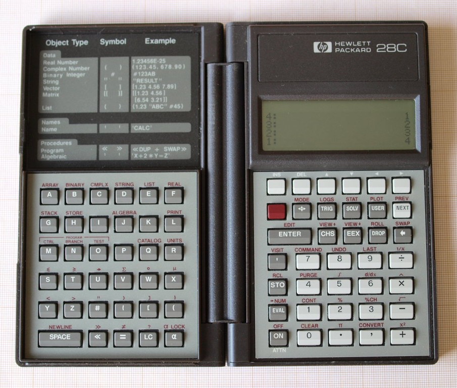 Le clavier du HP-71B est également personnalisable par le biais de grilles, comme les HP-41. Le HP-71B est considéré comme le micro-ordinateur BASIC ultime. Malgré une communauté de fans très active, il ne connaîtra pas de successeur, probablement à cause de son prix aristocratique ($525), beaucoup plus élevé que celui de ses concurrents moins huppés. Le HP-28CCette machine marque un tournant dans le développement des calculateurs HP. La logique RPN s'efface (partiellement) au profit du système RPL (Reverse Polish Lisp). L'utilisateur courant se retrouve avec une pile opérationnelle "illimitée" : c'est peut-être commode pour éviter le recours aux variables, mais cela rend caduque la duplication du "registre T" si pratique pour les calculs avec constante. La fonction "LASTx" disparaît également.Défrichant un nouveau système, le HP-28C perd en efficacité sur certains points. Les variables sont nommées : la première mise en mémoire, qui exige de taper le nom complet de la variable, s'avère fastidieuse. La logique de programmation différente fait appel aux structures itératives et aux variables locales. Elle nécessite un temps d'adaptation, mais s'avère d'une grande rapidité lors des calculs. L'usage abondant des lettres nécessite un clavier alphabétique complet. Le nombre de touches oblige HP à recourir à une structure pliante, pour conserver un format acceptable. Le système est bien réalisé mécaniquement (double charnière), mais d'apparence subjective fragile, et peu confortable d'utilisation en position "repliée ouverte". Le cadran, plus épais, se replie dans une partie creuse judicieusement occupée par un aide-mémoire.