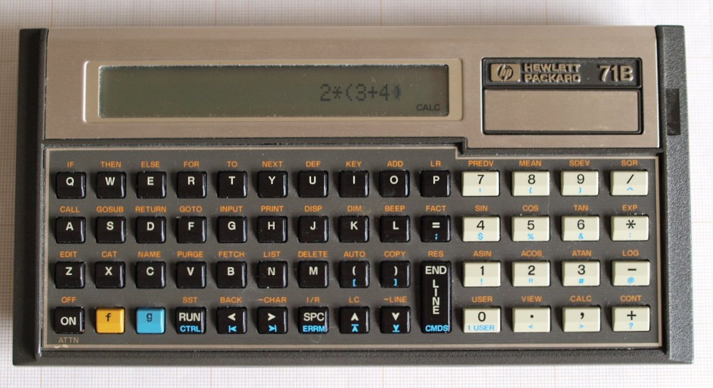 Quelques modèles dignes d'intérêt, bien que n'adhérant pas à 100% à la logique RPN.Le HP-71BAu début des années 80, la mode était aussi aux micro-ordinateurs programmables en BASIC [1]. Après un essai avec le peu avenant HP-75B, HP met sur le marché le HP-71B en 1984.