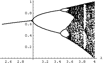 La théorie du chaos peut s'expérimenter avec une simple calculatrice. On définit une suite récurrente un+1 = f(un) où f est l'application logistique x ↦ λx(1-x) On fait ensuite varier λ (depuis 0). D'abord la suite converge. Puis elle diverge, mais u2n et u2n+1 oscillent entre deux valeurs différentes ("période 2"). Une bifurcation a eu lieu. Puis apparaît la "période" 4, puis 8, puis 16... Puis survient un comportement "aléatoire" : c'est le chaos. Des u0 très proches donnent des un très éloignés : le chaos, c'est l'imprévisibilité. Si l'on augmente encore λ, apparaissent d'autres "fenêtres de régularité" avec les périodes 3, puis 6, 9, 12...