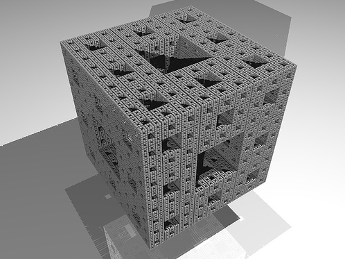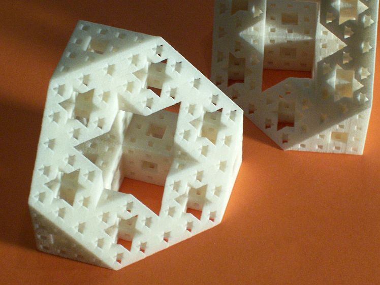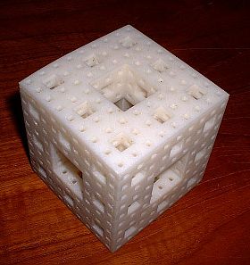 Voici pour ceux qui trouvent le tore vulgaire ("ce n'est qu'un vil arceau"). L'éponge de Menger s'obtient en retirant d'un cube le 1/27 central et les 6 cubes centraux de chaque face, puis en répétant le processus pour chaque "petit cube" restant, etc. ad infinitum.