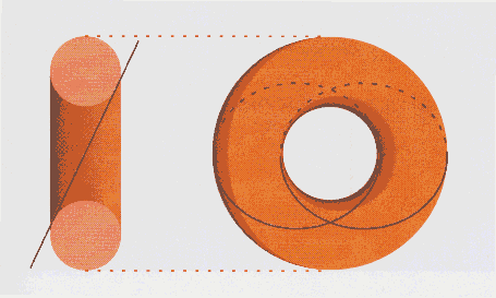 Pour engendrer un tore, rien de plus facile. Il suffit de prendre un cercle, de le faire tourner autour d'un axe qui lui est coplanaire mais non sécant, et le tour est joué. On dit que le tore est une surface de révolution. Outre la famille de ses cercles générateurs (ses méridiennes), le tore contient une autre famille "évidente" de cercles. On les obtient en coupant le tore par tout plan perpendiculaire à son axe de révolution. Mais il existe une troisième famille de cercles, plus étonnante, cachée dans le tore. Ce sont les cercles de Villarceau. Voici comment les déterminer. Il existe des plans qui sont tangents au tore en exactement deux points (cf. schéma).