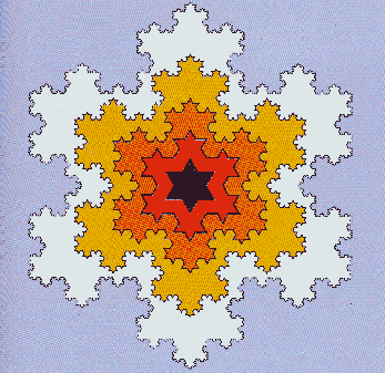 Cinq étapes de la construction du "flocon de neige" de Helge Von Koch. Cette "courbe" est un exemple simple d'ensemble fractal (qui contient des copies en réduction de lui-même).