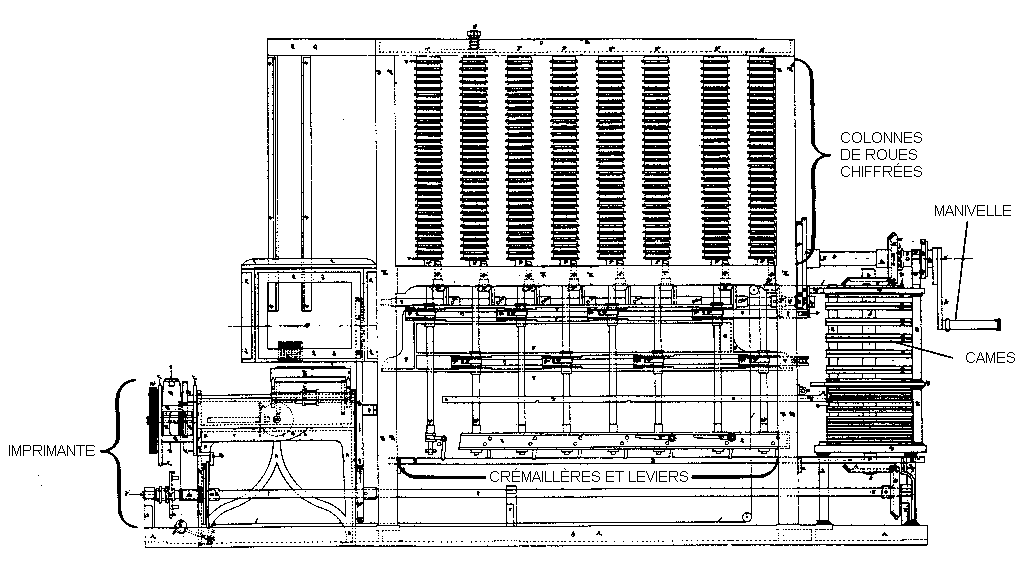 1. historiqueUne page d'une ampleur inhabituelle pour rendre justice au génie de Charles Babbage (1791?-1871). ![]() Les détails sur sa naissance (et en particulier sa date) sont en partie inconnus. On sait que son père Benjamin Babbage, riche banquier londonien, n'eut aucun mal à lui assurer une éducation de haut niveau dans les meilleures écoles privées. Il ne profita pas autant qu'il l'aurait pu de la fortune paternelle, car en 1814 il se maria sans autorisation de son père. Il disposait néanmoins d'une richesse personnelle suffisante pour mener une existence d'autodidacte éclairé, s'attaquant aux questions qui excitaient sa curiosité et son imagination. Ses contributions scientifiques sont multiples et éclectiques : citons pêle-mêle l'étude des climats du passé grâce aux stries de croissance des arbres, les premières études statistiques de mortalité qui font encore référence aujourd'hui et la cryptanalyse du chiffrement polyalphabétique de Vigenère demeuré inviolable depuis deux siècles. Sa carrière scientifique trouva sa véritable voie lors de sa rencontre avec l'astronome anglais John Herschel en 1812. Les deux hommes examinaient des éphémérides maritimes permettant de calculer la position des navires. Ils y trouvèrent, à leur grand désarroi, plus de 1000 erreurs ! Pour la plupart de nature typographique, elle portaient la responsabilité de plusieurs naufrages. Babbage entreprit alors la mécanisation complète de la production de ces tables, depuis le calcul à l'impression. Il construisit une petite machine à différences de 1819 à 1822. Le nom ne signifie pas que la machines était spécialisée dans les soustractions, mais qu'elle calculait les valeurs des polynômes par la méthode des différences successives. Ce petit prototype fonctionna bien. Aussi Babbage se lança-t-il dans conception de la machine à différences n°1 , pour laquelle il obtint une subvention plus que confortable du gouvernement anglais. En 1823, le plan prévoyait 25 000 pièces mais la réalisation se heurtait à des difficultés techniques insolubles. Babbage délaissa alors le projet en cours pour la machine à différences n°2 , à la fois plus simple et plus perfectionnée. Simultanément le gouvernement anglais effrayé par les sommes déjà engagées se retirait en coupant les vivres à Babbage. Celui-ci en conçut de l'amertume, car la conception de l'engin était achevée. Mais il avait déjà en tête un projet plus ambitieux encore : la machine analytique, qui disposerait d'un moulin permettant d'exécuter des instructions stockées au préalable, sur des données elles-même rangées dans un magasin. Babbage jetait ainsi la base d'une architecture, pour des ordinateurs encore à inventer, qui allait être amplement validée par les évolution technologiques ultérieures. 2. technique et réalisationEn 1822, le prototype de Babbage est fonctionnel, selon le principe des roues dentées tournant d'1/10ème de tour. Babbage essaie ensuite à partir de l'année suivante de concrétiser sa machine à différences n°1, énorme appareil de 25 000 pièces, 2,10x2,40x1,20 m et plusieurs tonnes. En 1833, il est contraint de renoncer pour des raisons plus financières que techniques semble-t-il. Mais auparavant, en 1832, l'artisan Clement avait réalisé pour lui un sous-ensemble de ladite machine, constitué de 2000 pièces. ![]() Le fonctionnement fut parfait. Cet engin était le premier à réaliser automatiquement un calcul (sans intervention de l'utilisateur, hormis pour l'initialisation). Jusqu'à 1849, Babbage se concentre sur la machine analytique. Il la conçoit programmable par cartes perforées, comme les métiers à tisser de Jacquard. Elle doit pouvoir effectuer toute séquence de calculs élémentaires (+, -, x, /), sur des nombres de 100 chiffres, définie à l'avance, et fournir ses résultats également à l'aide de cartes. Elle ne sera jamais construite, en dépit des efforts de son concepteur. Mais Babbage, échaudé par son premier déboire, ne tente pas de réaliser directement la machine analytique. Comme tremplin vers celle-ci, il dessine la machine à différences n°2. Une manivelle attaque une pile de 14 paires de cames responsables du déroulement du cycle opératoire. La représentation des nombres est dévolue à 8 colonnes de 31 roues (10 de mieux que dans la machine n°1) portant les chiffres, les unités étant en bas. Pour introduire les données initiales, les colonnes peuvent être débloquées et il suffit de faire tourner manuellement les roues. Au-dessous de cet ensemble, un jeu de crémaillères et de leviers font monter, descendre ou tourner les colonnes de chiffres selon l'opération à réaliser. Le raffinement du système dépasse la simple mécanique pour atteindre le niveau algorithmique. Lors de la première moitié du cycle, les colonnes impaires sont ajoutées aux colonnes paires et vice-versa pendant la seconde moitié. Ce principe dit en pipe-line accélère notablement le calcul ; il est encore appliqué aujourd'hui dans la conception des processeurs. La dernière colonne est couplée à un dispositif d'impression des résultats. Chaque tour de manivelle effectue un cycle et prépare le suivant ; Babbage avait prévu à terme de remplacer celle-ci par une motorisation à base de machine à vapeur. En 1985, A. Broomley et D. Swade, du musée des sciences de Londres, forment le projet de réaliser une réplique de la machine à différence n°1 à l'occasion du bicentenaire de la naissance de Babbage (1991). Ils se penchent sur les plans, 20 dessins et quelques calques, qui sont bien conservés. C'est l'une des raisons de leur choix, l'autre étant la (relative) moindre complexité de la machine n°2 par rapport à son aînée. En étudiant les dessins de Babbage, ils relèvent quelques "bogues mécaniques". Babbage a omis de re-verrouiller les colonnes de chiffres après leur déblocage pour introduction des donné
