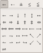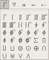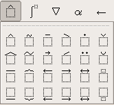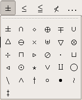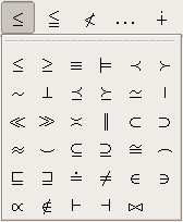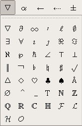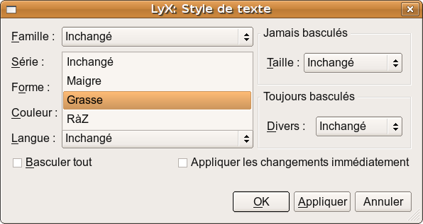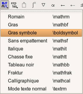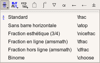 Les noms de fonctions mathématiques sont dans une (longue) liste déroulante : ![]() LyX connaît tout sur les racines : et les fractions :![]() Voici enfin une liste de symboles divers en LyX : ![]() FontesLyX a des commandes prédéfinies pour appliquer les styles de polices les plus courants :