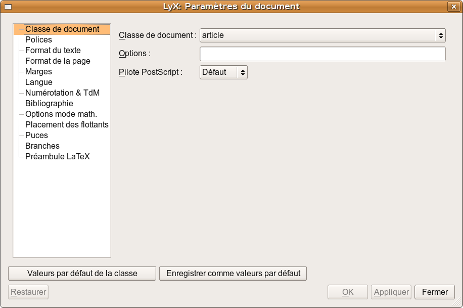 Découvrir LyXUtiliser LyXLyX et LATEXCorrespondanceCaractèresMathsFontesTablesStructureParagraphesEspaces |