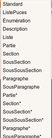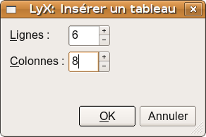 ![]() qui s'obtient par Editer > Style de texte > Personnalisé ou , et qui permet aussi de régler les tailles.Les styles mathématiques s'obtiennent dans une autre palette : ![]() TablesRien de plus facile avec LyX, qui vous fait oublier la syntaxe LATEX correspondante.Il suffit de cliquer sur le bouton "Insérer un tableau" : et de faire glisser la souris jusqu'à ce que la taille appropriée s'affiche : .On peut aussi passer par la boîte de dialogue Insérer > Tableau : .La barre d'outils "Tableaux" contient tout ce qu'il faut pour régler bordures et alignements : .StructureLa classe du document (ainsi que les options de classe) se définissent sous Document > Paramètres > Classe du document :![]() Nous avons déjà rencontré le menu déroulant des sections, sous-sections et autres : ![]() Rappelons que celles qui sont "étoilées" ne seront pas numérotées [1]. L'interface graphique de LyX en tient compte. Cette barre d'outils : vous permet de mettre en place des listes numérotées, à puces, à en-têtes,