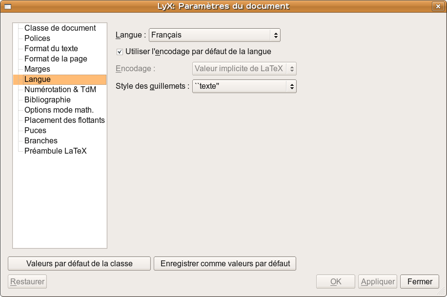 Dans cette page, nous présentons les "traductions" LyX des commandes LATEX décrites dans cette section (dont nous conservons le plan). Il s'agit donc des commandes LATEX que LyX permet d'utiliser "sans le savoir", étant donné qu'elles ont un équivalent direct dans l'interface graphique de LyX. Nombre d'entre elles deviennent ainsi bien plus faciles à utiliser que les "versions originales". CaractèresLes caractères spéciaux de TEX : $ # % & \ { } ^ _ ~ redeviennent dans LyX des caractères "ordinaires". On peut les utiliser sans précaution particulière. LyX se charge de les convertir dans une syntaxe LATEX correcte lorsqu'il passe le relais à ce dernier.Les accents ordinaires s'obtiennent directement au clavier. Les accents plus exotiques sont dans la palette "décorations" : ![]() LyX se charge lui-même de supprimer le point du i (ou du j) s'il est surmonté d'un tréma. Il suit les conventions de TEX concernant les tirets et les ligatures. Le type de guillemets utilisé peut être personnalisé document par document : Document > Paramètres > Langue ![]() MathsNous avons vu dans notre premier document LyX comment distinguer les mathématiques en ligne et les mathématiques en hors-texte (ou centrées).Nous avons déjà rencontré les lettres grecques. Plus généralement, LyX propose une palette pour chaque famille de caractères mathématiques :
