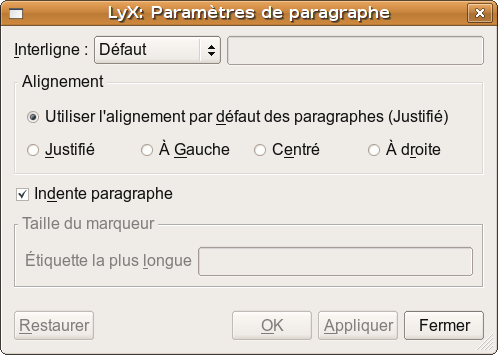 ParagraphesLe menu Insérer > Typographie spéciale :![]() ... contient tout ce qu'il faut pour placer des sauts de ligne, de page aux endroits stratégiques du document. Les paragraphes nécessitant un alignement particulier s'obtiendront par : Editer > Style de paragraphe ou , donnant accès à la boîte de dialogue des réglages, notamment d'interligne et d'alignement : .Les notes de bas de page et de marge s'obtiennent respectivement avec ces deux outils : . On obtient une boîte similaire à celle qui permet d'entrer du code LATEX. On peut la refermer de même, en cliquant dessus :