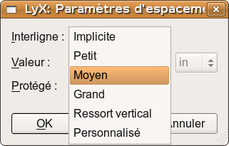 EspacesLes espaces standardisés LATEX sont présents dans le menu Insérer > Typographie spéciale déjà présenté, qui contient aussi le ressort horizontal.Les espaces fixes horizontaux (rarement utilisés) doivent être introduits à l'aide du "Vilain Texte Rouge" [2]. Le même menu donne aussi accès à la boîte de dialogue des espacements verticaux : Insérer > Typographie spéciale > Espacement vertical... ![]() qui propose le choix entre espacements prédéfinis (Petit / Moyen / Grand), fixes (Personnalisé), et les ressorts verticaux (Ressort vertical). Notes[1] Cas d'une sous-section qui serait seule dans sa section -- cela arrive. [2] En attendant d'être supportés dans une future version de LyX. |