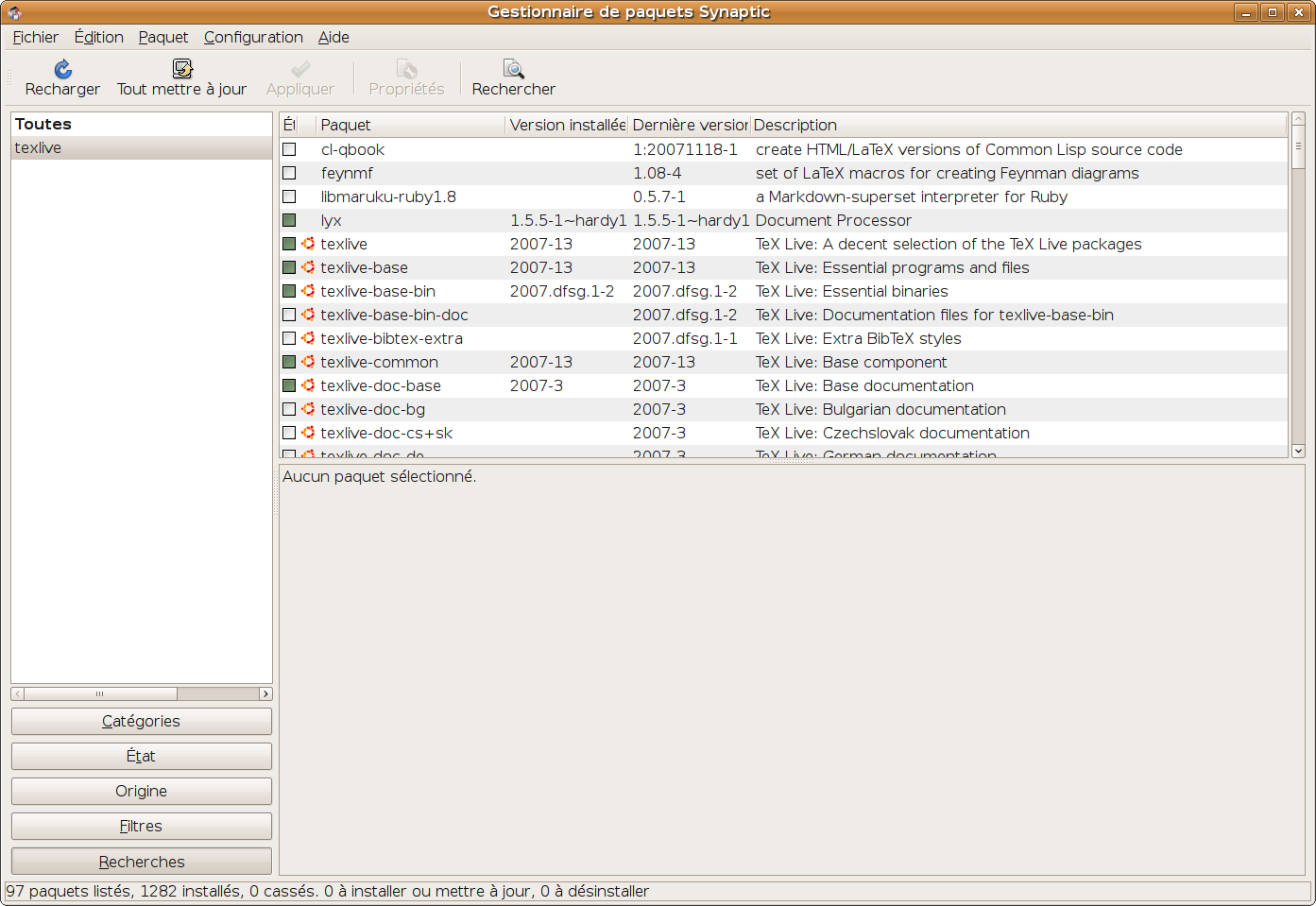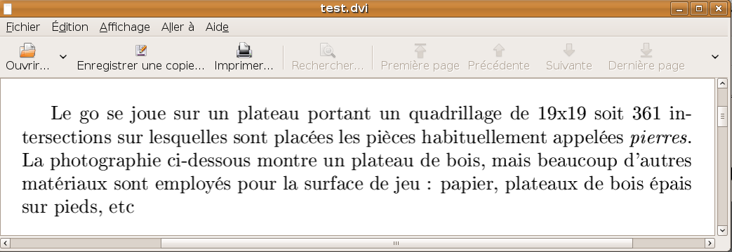 La séquence \it{pierres} indique à TEX d'écrire le mot "pierres" en italique. Si le texte précédent est enregistré dans un fichier nommé, disons, test.tex et qu'après avoir lancé le programme latex.exe [5] on tape \input test.tex on obtiendra typiquement un fichier test.dvi qui pourra être affiché par le "previewer" et rendra sensiblement le résultat suivant : On note que TEX a décidé lui-même de l'endroit où couper les lignes, et même les mots. De plus, le texte est justifié (aligné à droite et à gauche), ce qui est le style de composition par défaut de TEX. Où se procurer TEX ?Le choix est vaste. Il faut savoir que TEX n'est jamais proposé seul, mais toujours accompagné d'un ensemble de programmes (une "distribution") qui en rendent l'utilisation plus agréable. Il y a toujours LATEX, qui est incontournable. D'autres programmes permettent p. ex. de fabriquer des fichiers PDF ou HTML, de produire des schémas techniques... Sous LinuxUne distribution a le vent en poupe actuellement, et s'impose tout naturellement aux utilisateurs de Linux. Il s'agit de TeXLive. Si vous vous contentez de (souhaitez ?) faire du TEX "pur et dur" (tel que décrit dans ces pages), TeXLive est fait pour vous. Même si vous passez ensuite (dès le début ?) à LyX [6], ce dernier pourra réutiliser votre installation TeXLive existante. TeXLive n'est peut-être pas installé par défaut sur votre système. Il se compose d'une multitude de paquets ; tous ne sont pas indispensables. Recherchez "texlive" dans votre gestionnaire de paquets (ici Synaptic) :
