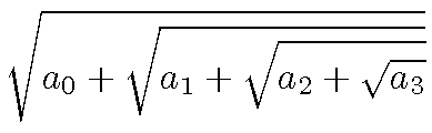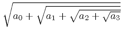 Notons la commande inverse de \displaystyle, \texstyle, qui force TEX à faire de "petites fractions" même en mode centré. RadicauxUne racine carrée (sans exposant) se code simplement \sqrt : $\sqrt 2$. En ce qui concerne les radicaux imbriqués, la différence entre les modes en ligne et centré tient à l'espacement entre les barres des racines carrées successives. Exemple en mode en ligne :